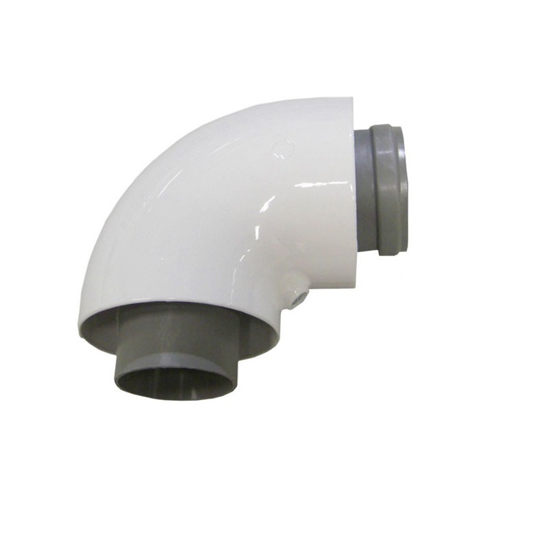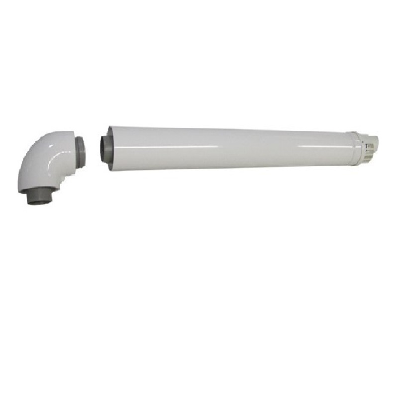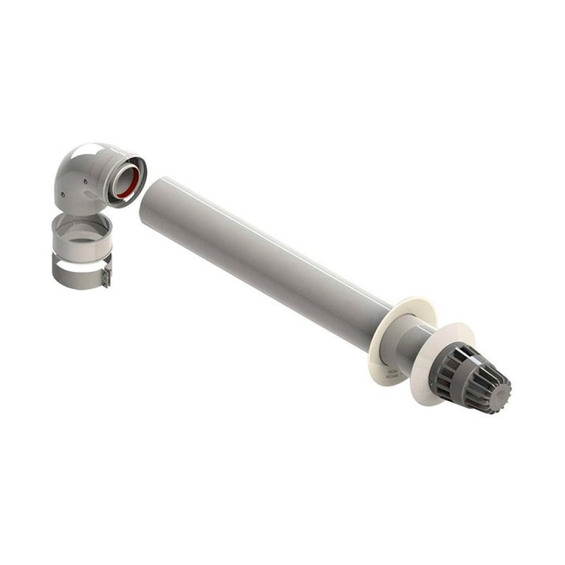 Состоит из: участка трубы для отвода продуктов сгорания/притока воздуха d.60/100 длиной 1000 мм; коаксиального отвода 90°; оголовка дымохода; соединительных хомутов, прокладок и крепежных винтов; 2-х декоративных манжет (внешней и внутренней) из материала EPDM для оформления прохода через стену.