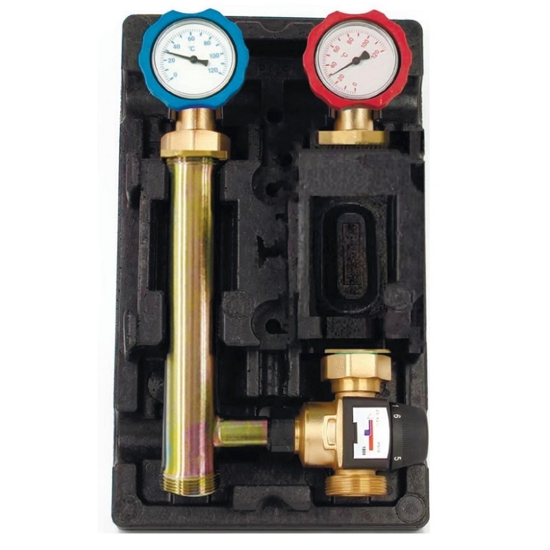 1 – Вставка-удлинитель (сталь EN 10217) 2 – Шаровой кран со штуцерами (латунь CW617N) 4 – Кронштейн (термопласт) 5 – Стрелочный термометр 6 – Защитный кожух (пенополиуретан ЕРР) 8 – трёхходовой термостатический клапан (латунь CW617N) |