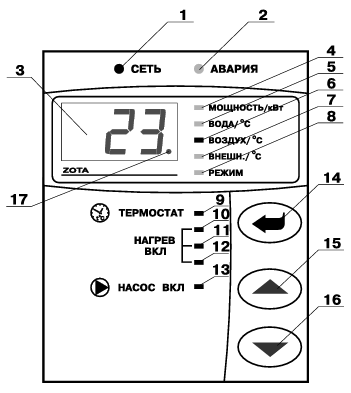2 – Индикатор аварийных режимов 3 – Цифровой индикатор 4 – Индикатор режима отображения мощности котла 5 – Индикатор режима отображения температуры теплоносителя 6 – Индикатор режима отображения температуры воздуха помещения 7 – Индикатор режима отображения температуры воздуха улицы 8 – Индикатор режима отображения работы внутреннего термостата 9 – Индикатор работы термостата 10, 11, 12 – индикаторы включения ступеней мощности котла 13 – Индикатор работы насоса 14 – Кнопка ввода режимов работы котла 15 – Кнопка увеличения показаний 16 – Кнопка уменьшения показаний 17 – Индикатор работы модуля GSM/GPRS или LAN |