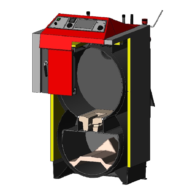 - Большая дверца топливного бункера позволяет сжигать куски большого диаметра