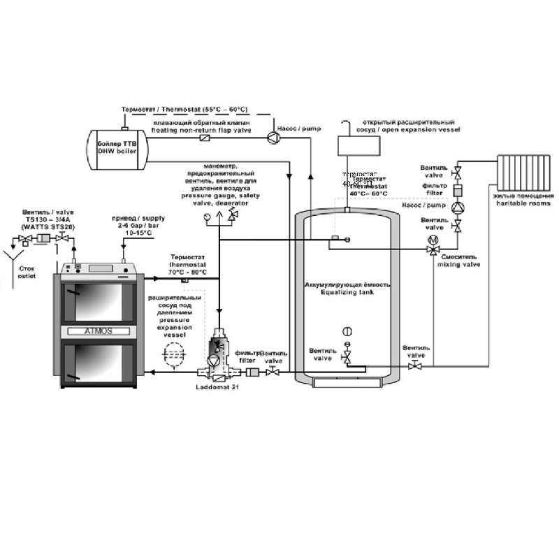 Каждый пиролизный котел ATMOS можно оснастить электронной автоматикой управления, которая поддерживает заданную температуру в различных контурах всей системы отопления в зависимости от наружной и комнатной температуры, и времени суток. Управляет котлом через интернет или мобильную связь.