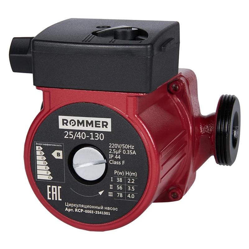 Rommer 25/40-130 – качественная разработка российского бренда в сфере насосного оборудования. Прибор, оснащенный ротором «мокрого» типа, способен работать в одном из трех режимов, выбранном пользователем. Модель устойчива к высокому давлению в отопительной системе и резким перепадам температуры.