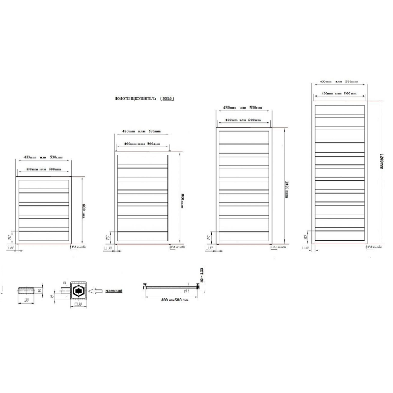 | Размер (Межосевое x длина) мм. | Количество перекладин | Тепловая мощность (Вт.) | Материал |