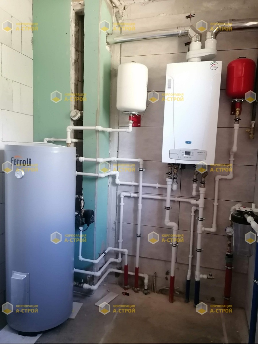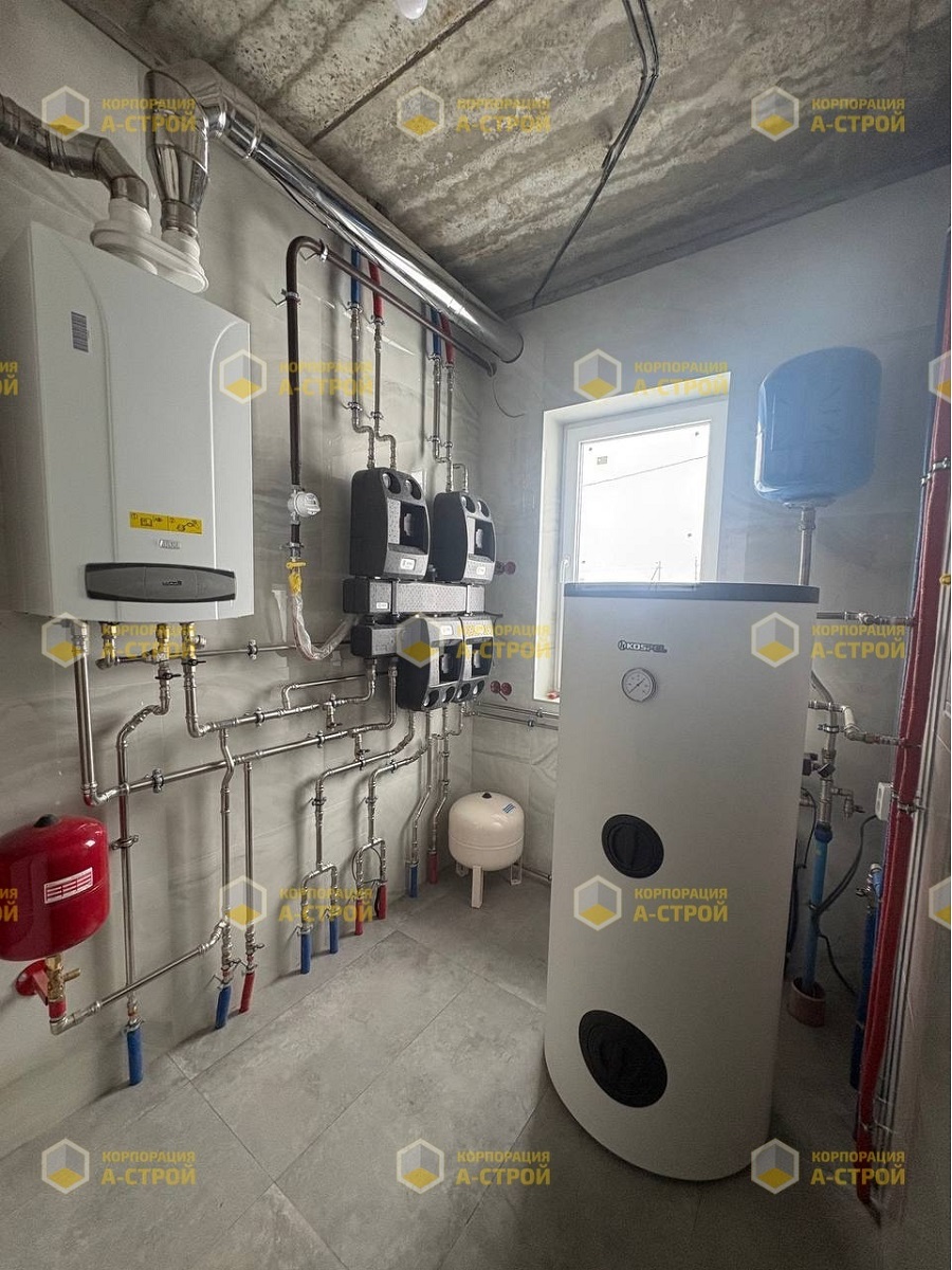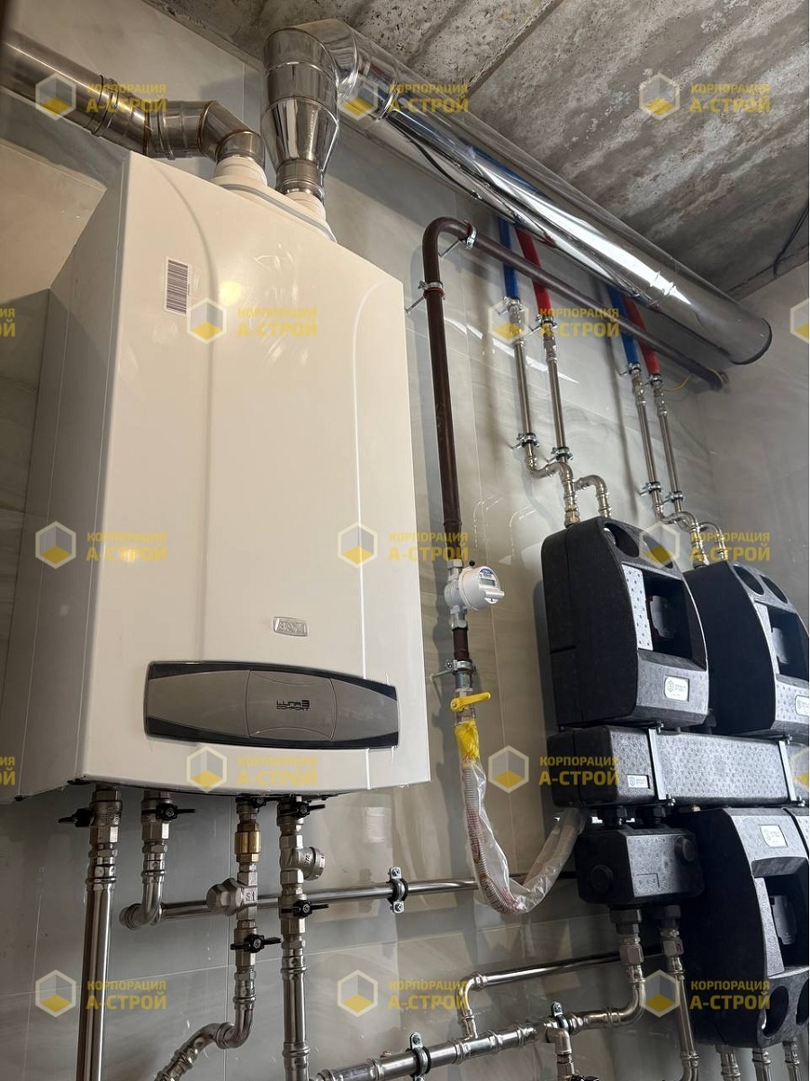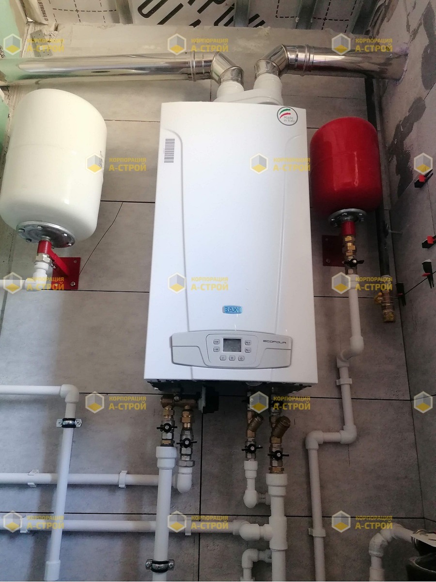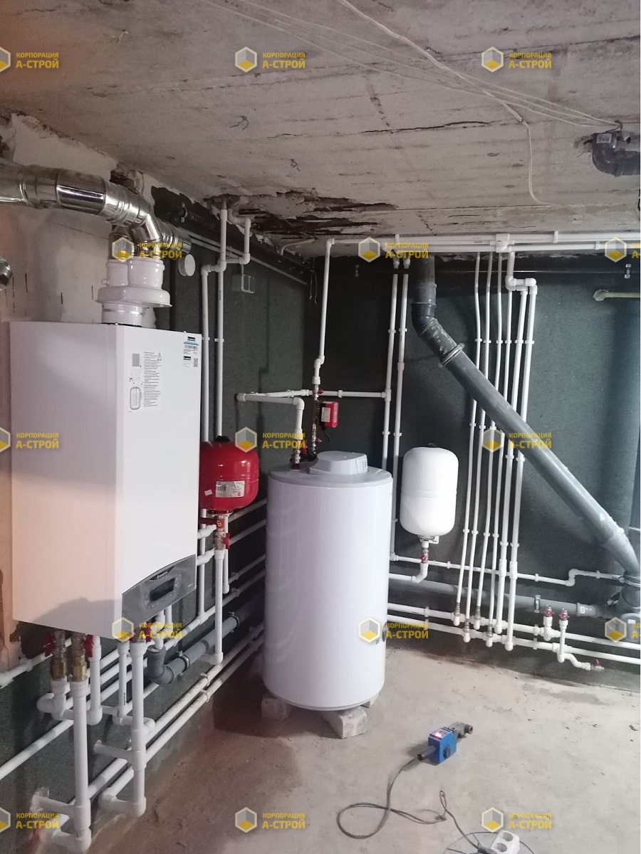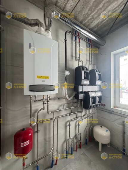 Монтаж газового котла с раздельной системой дымоудаления, бойлера косвенного нагрева, расширительных баков, гидроаккумулятора, распределительного коллектора с гидрострелкой и группами быстрого монтажа.