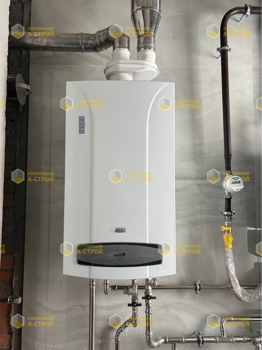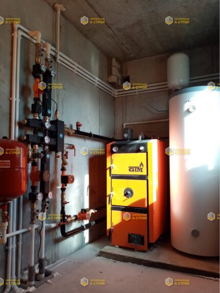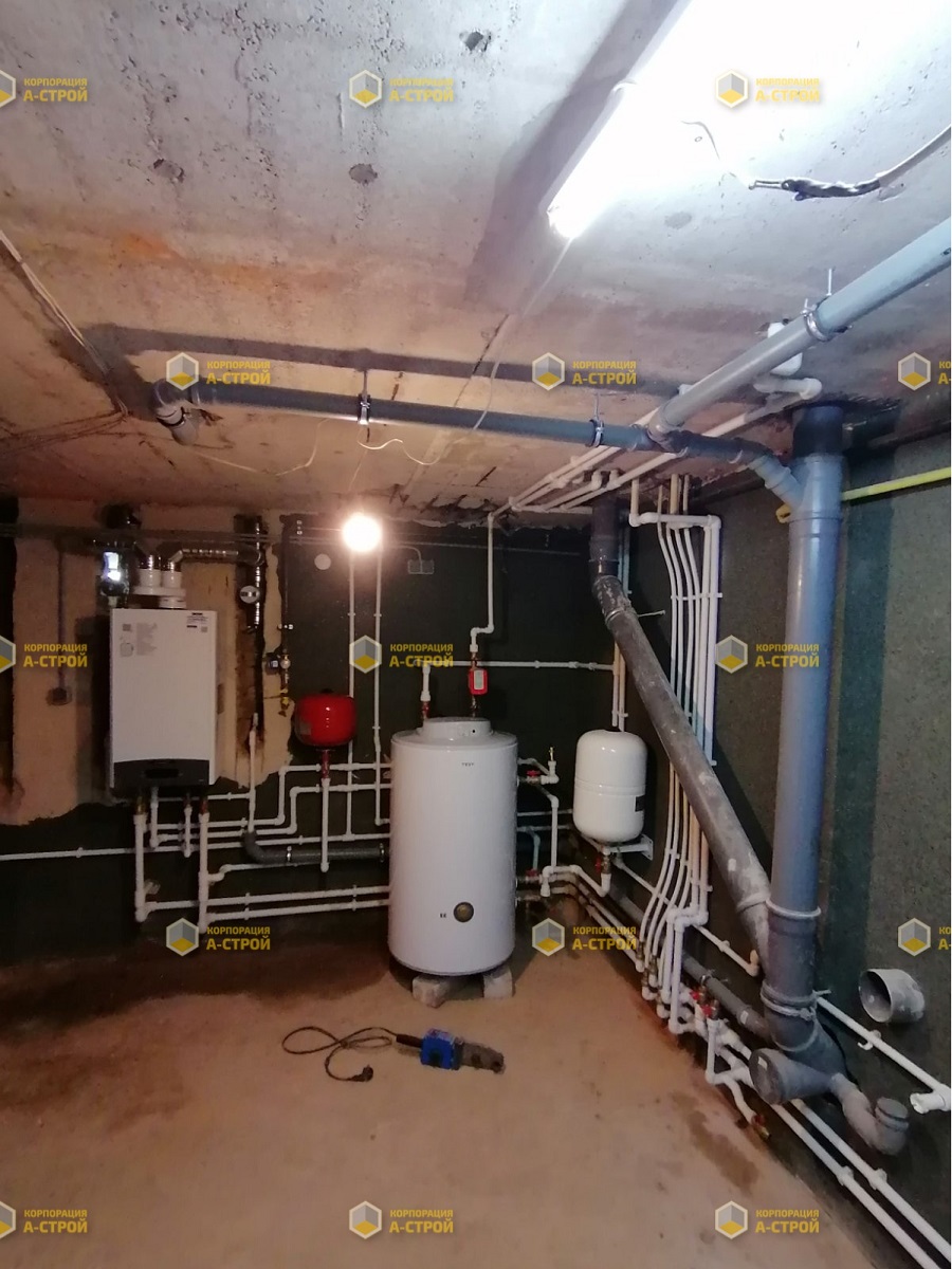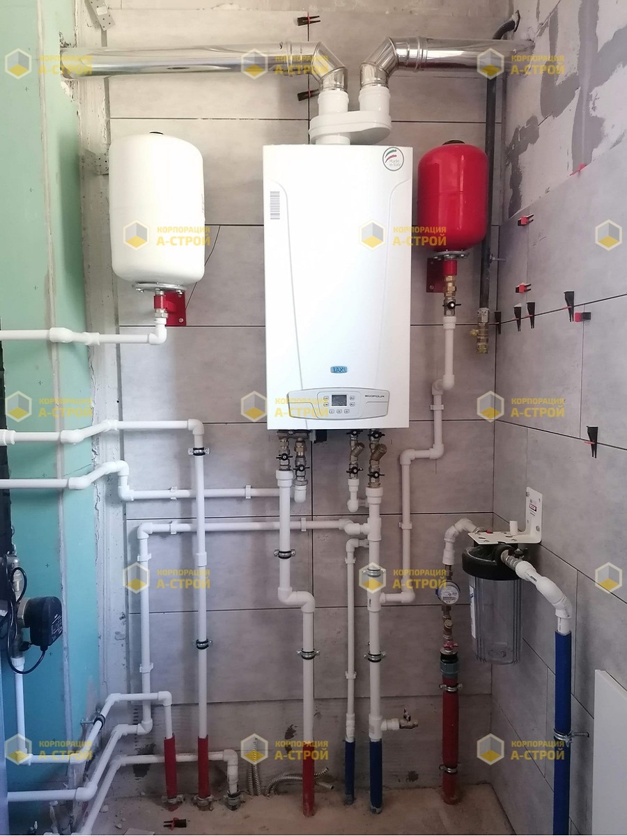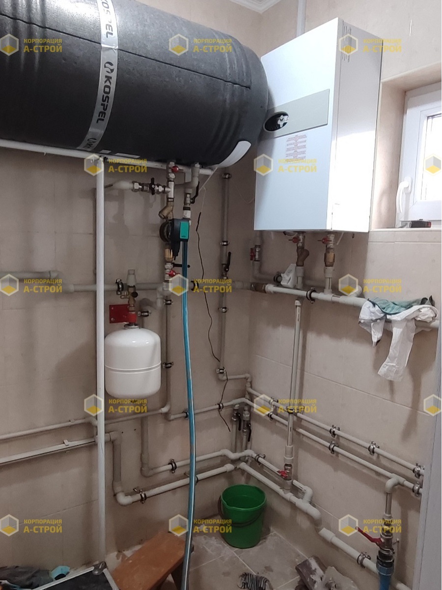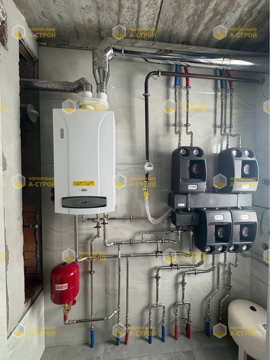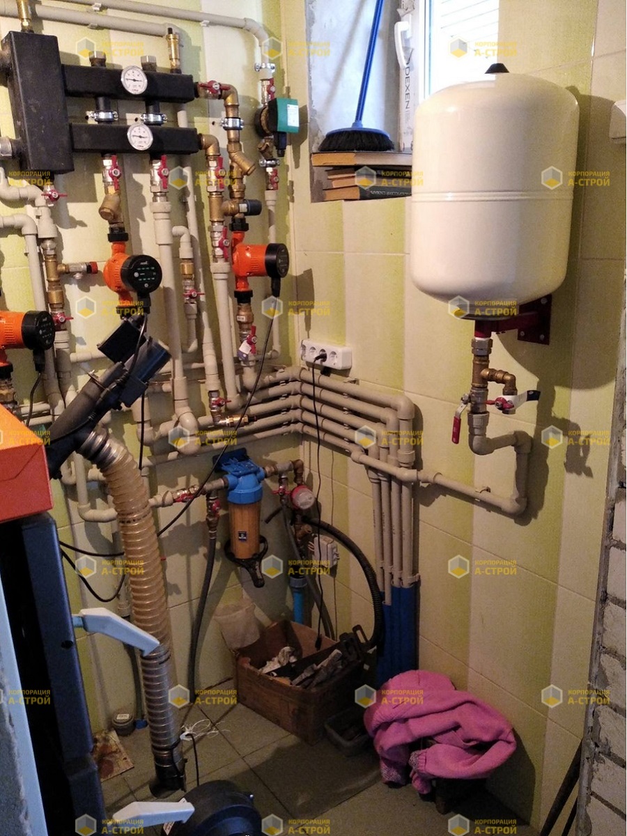 Монтаж газового котла с раздельной системой дымоудаления, бойлера косвенного нагрева, расширительных баков, гидроаккумулятора, распределительного коллектора с гидрострелкой и группами быстрого монтажа.