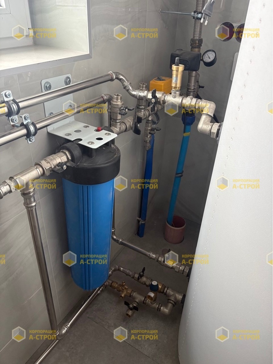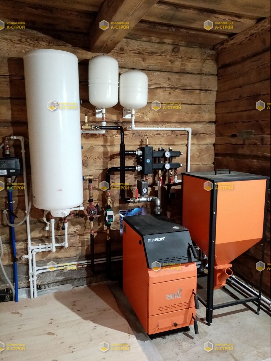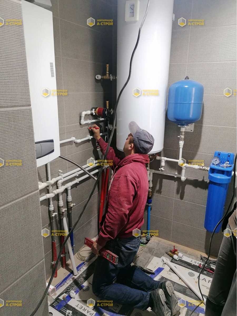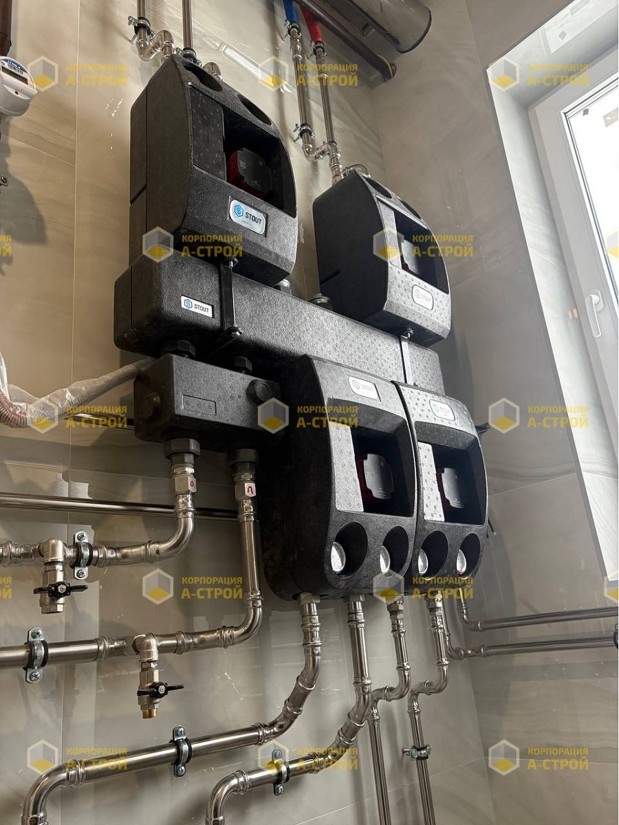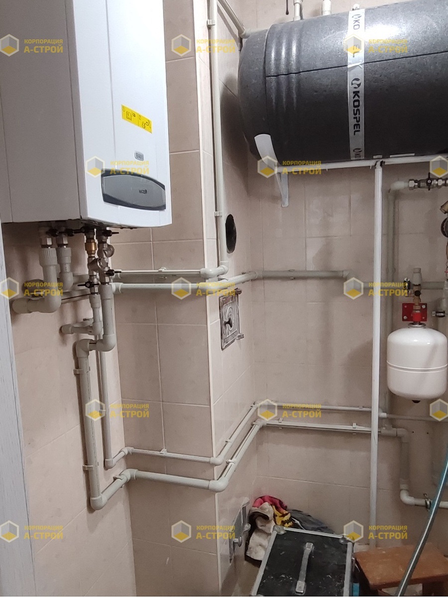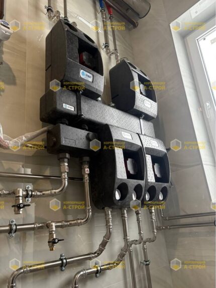 Монтаж газового котла с раздельной системой дымоудаления, бойлера косвенного нагрева, расширительных баков, гидроаккумулятора, распределительного коллектора с гидрострелкой и группами быстрого монтажа.