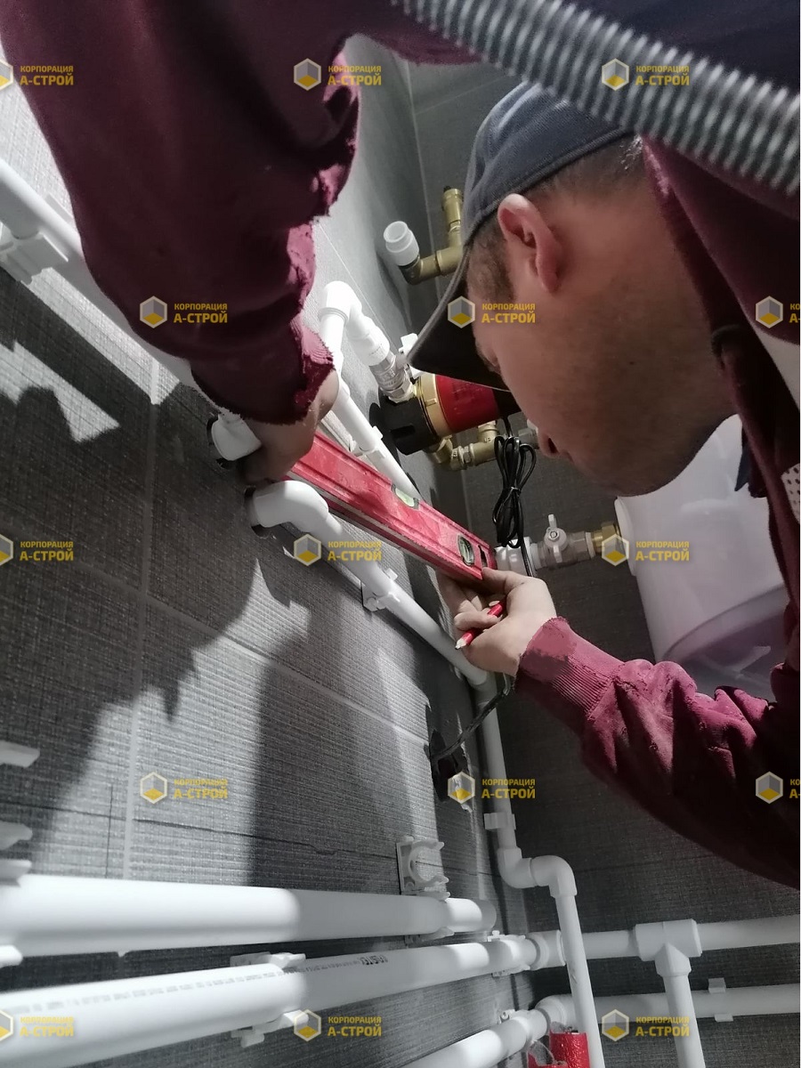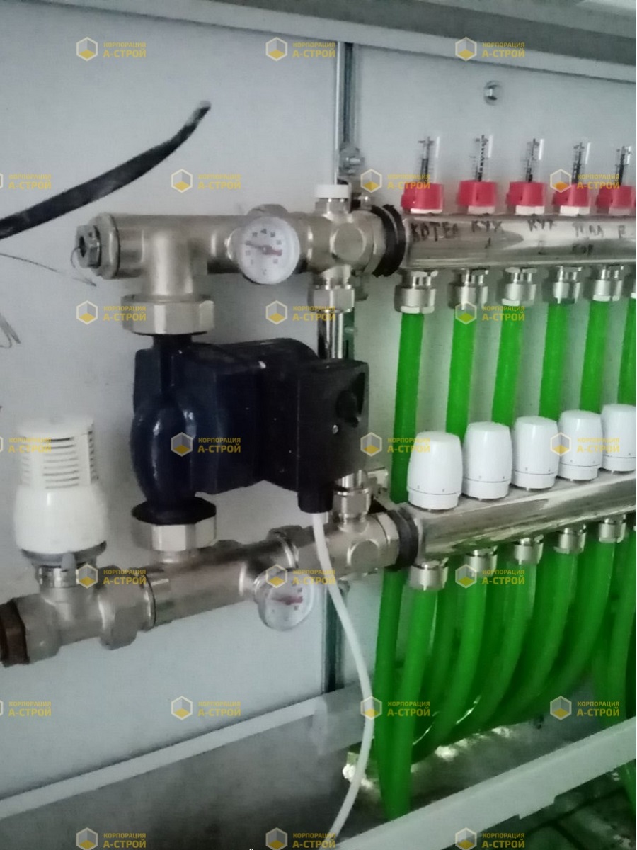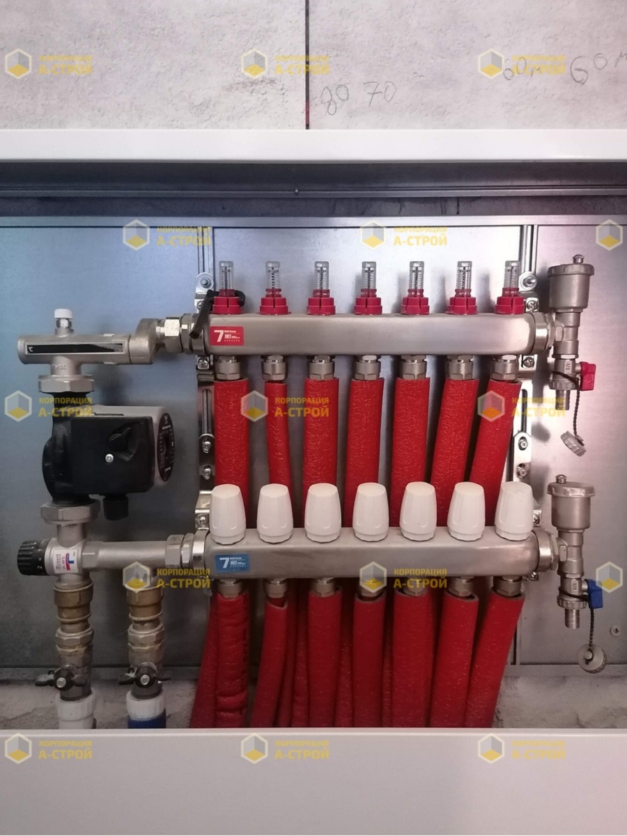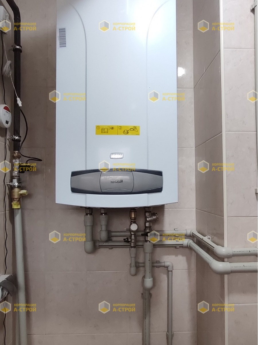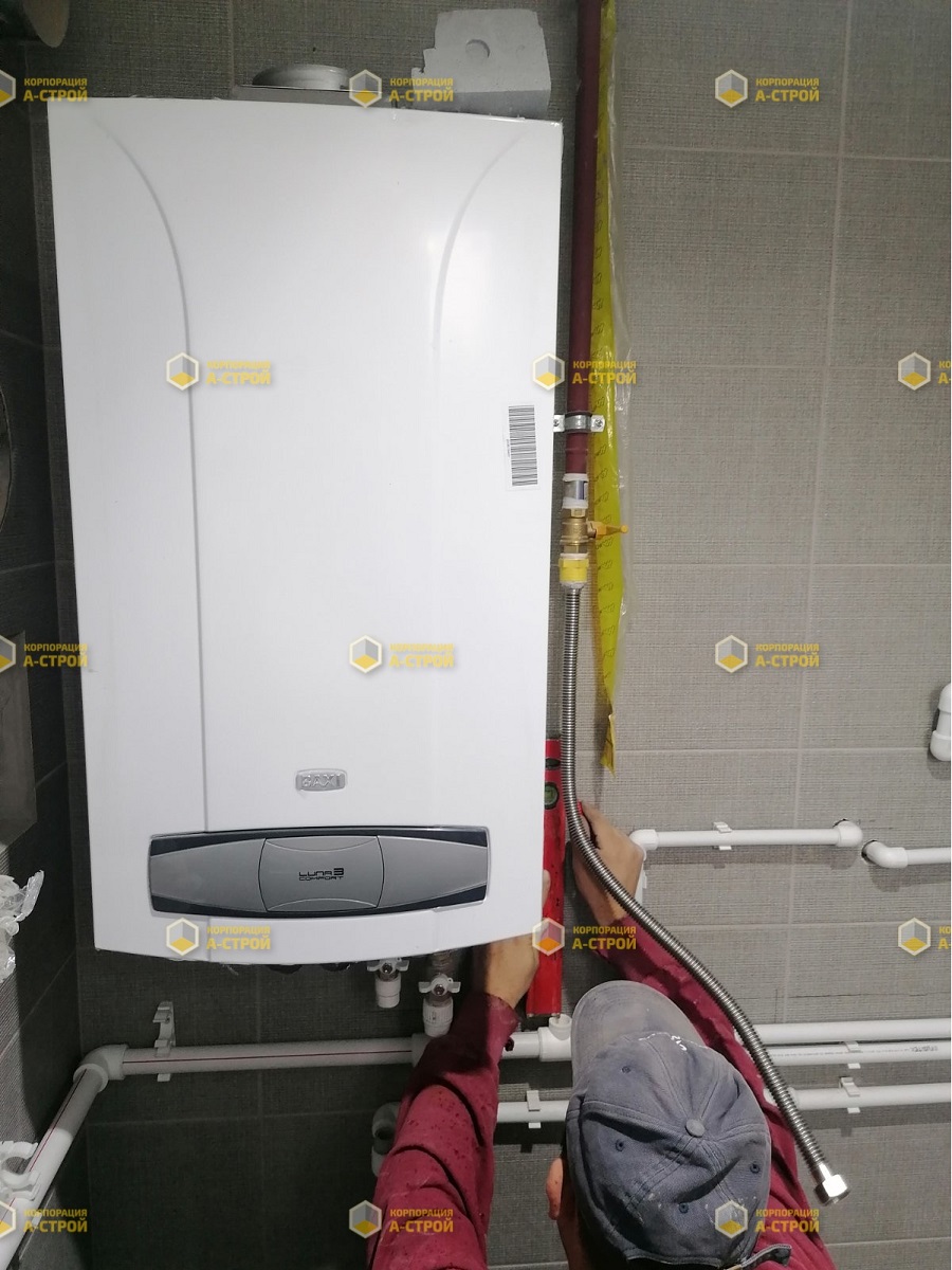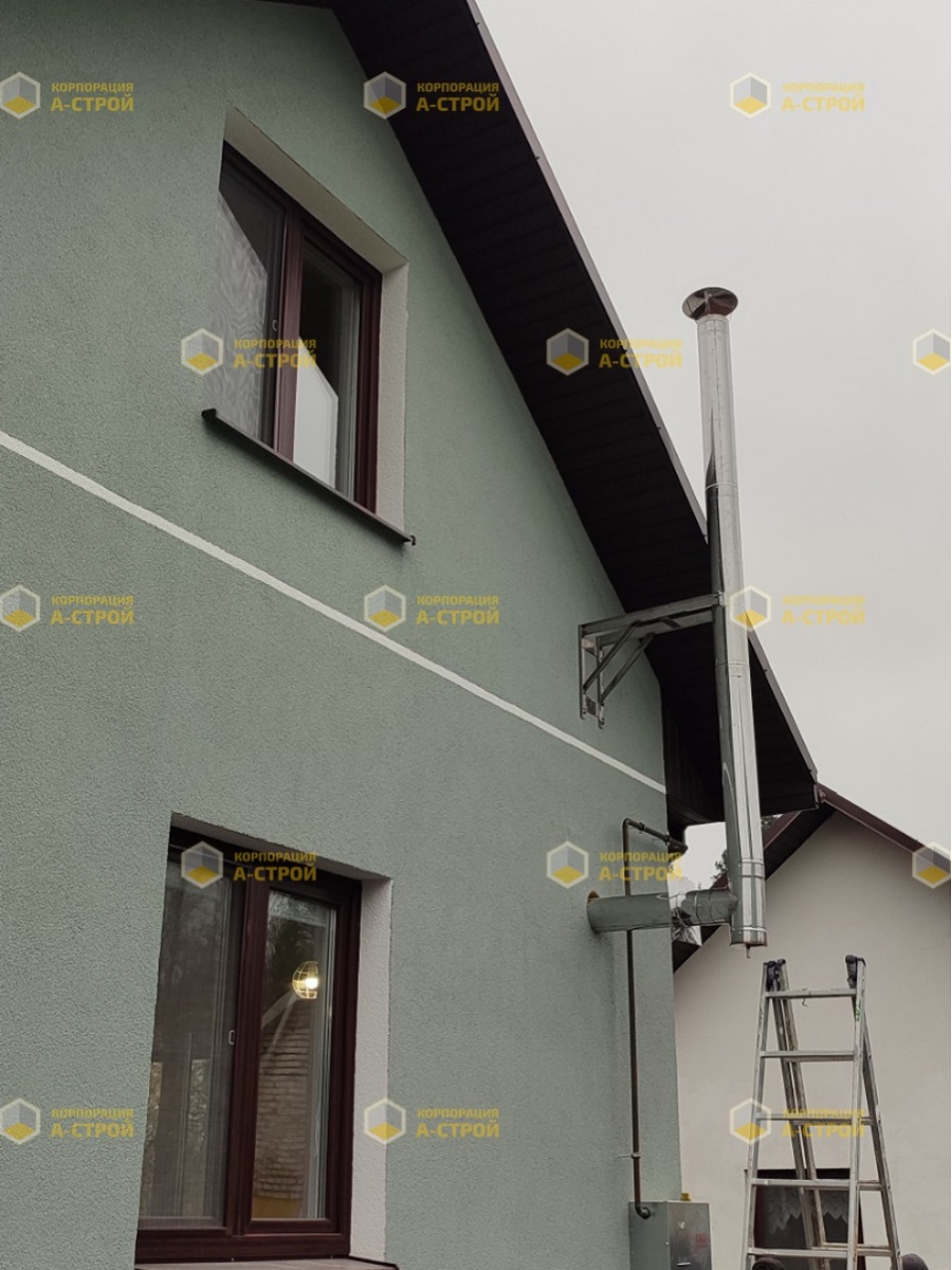 Монтаж газового котла с раздельной системой дымоудаления, бойлера косвенного нагрева, расширительных баков, гидроаккумулятора, распределительного коллектора с гидрострелкой и группами быстрого монтажа.