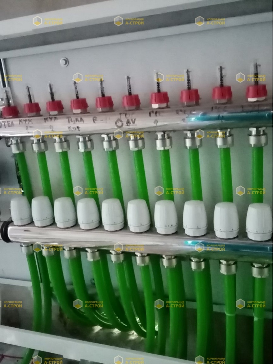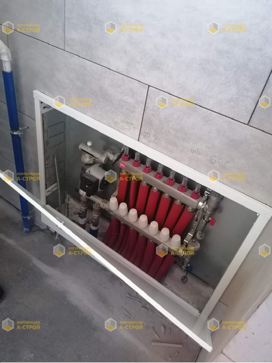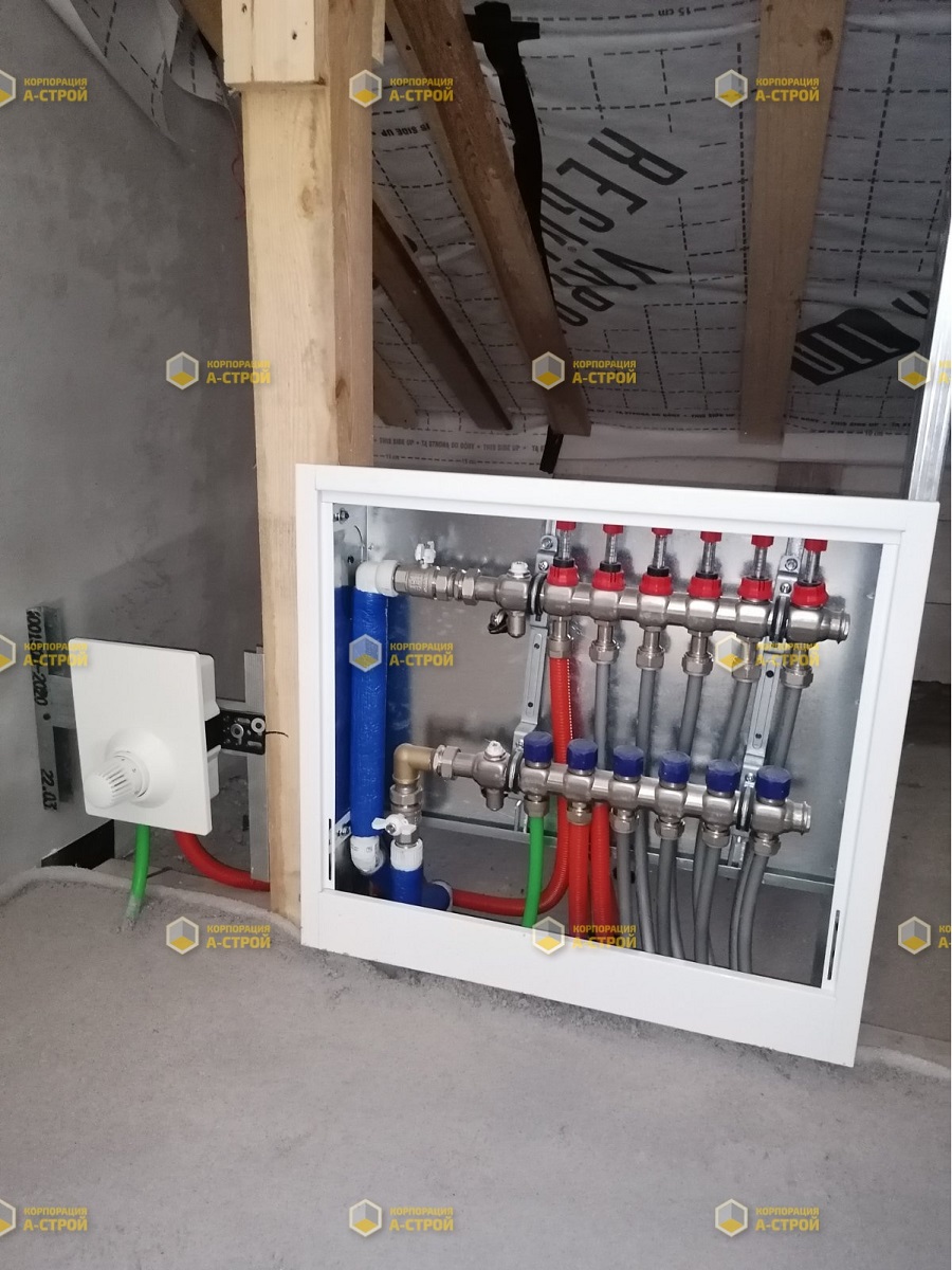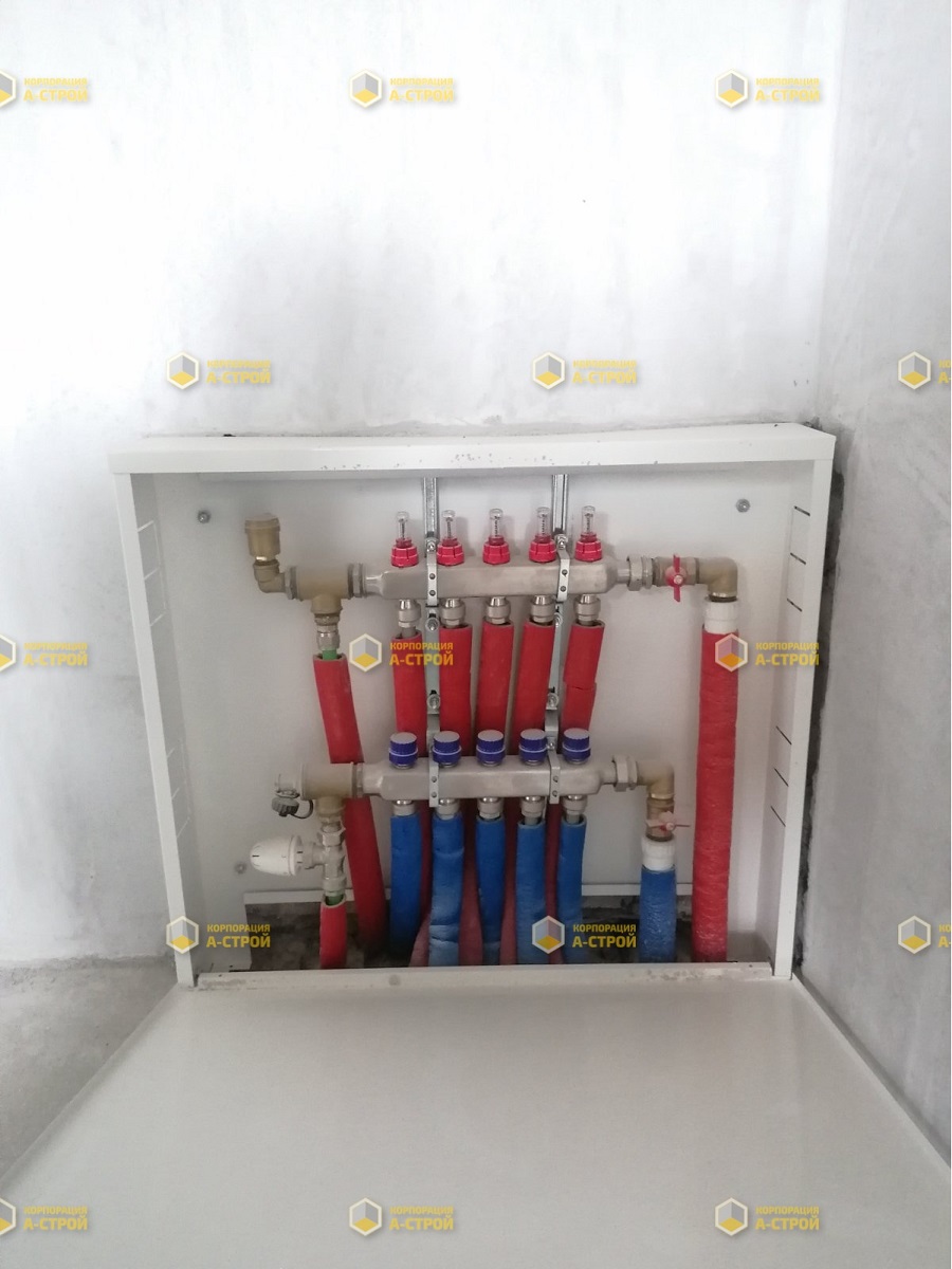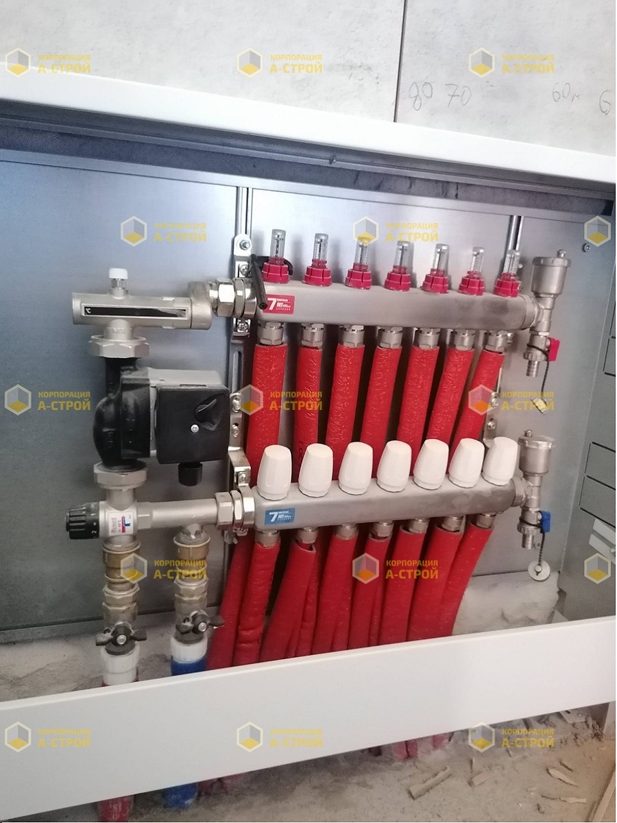 Монтаж газового котла с раздельной системой дымоудаления, бойлера косвенного нагрева, расширительных баков, гидроаккумулятора, распределительного коллектора с гидрострелкой и группами быстрого монтажа.